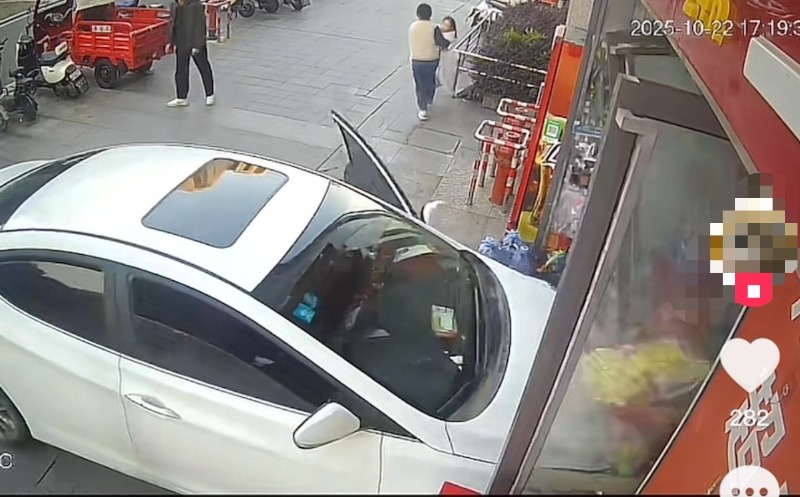 据了解,该便利店位于一处商业街内,涉事车辆是从街边停车场方向冲过来的。“白车先是撞断了停车位后方的隔离栏杆,然后直接冲上人行道撞进店里。”邓女士补充道。